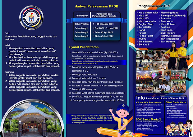 Nah hal diatas ini merupakan visi, misi dan sasaran di SMPK Santa Maria 2 Malang. Serta terdapat jadwal dan syarat pendaftaran sebagai siswa baru.